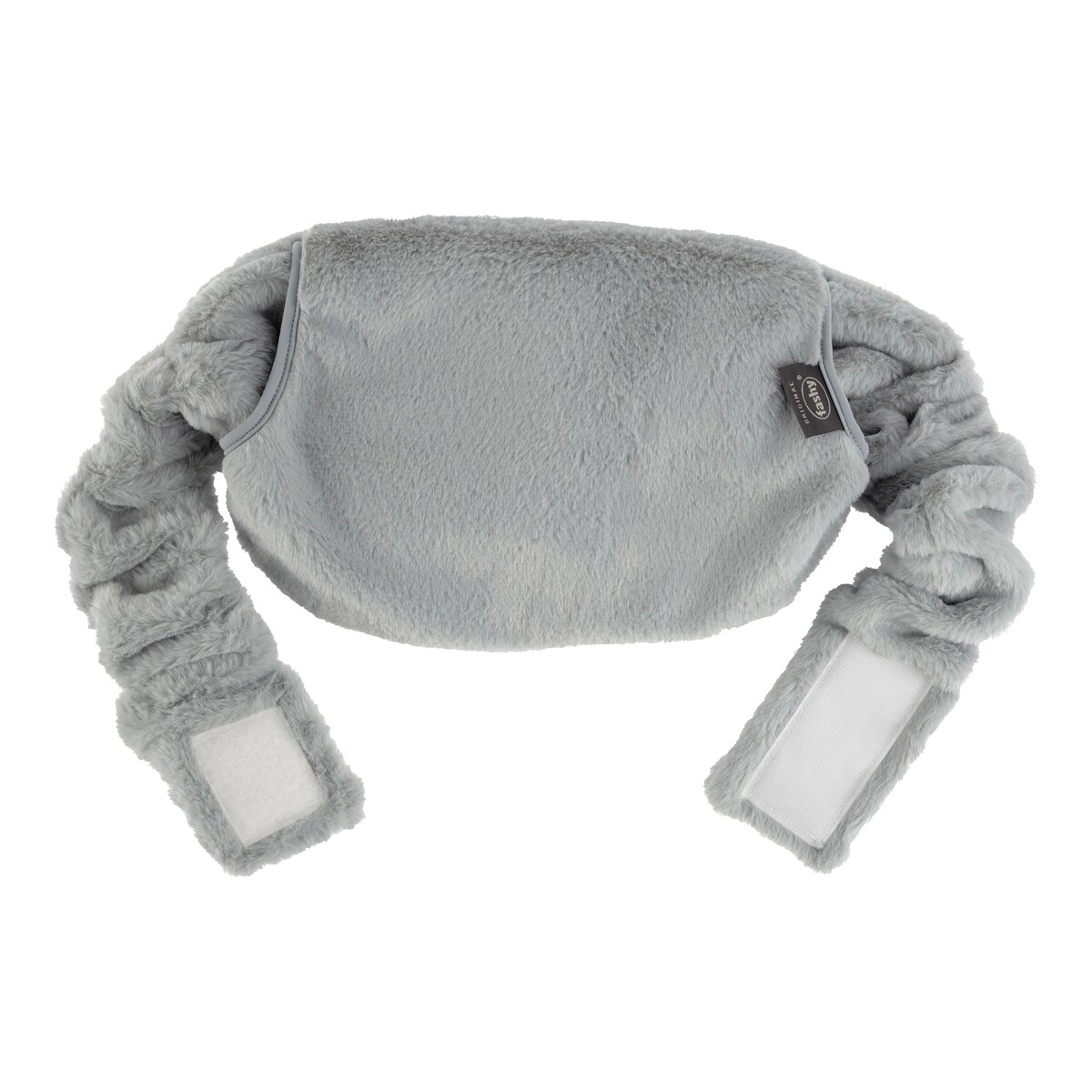 Flauschige Bauchtasche mit Wärmflasche und einer Mufffunktion. Auch als Rückenwärmer einsetzbar. Mit Klettverschluss. Bezug abnehm- und waschbar.