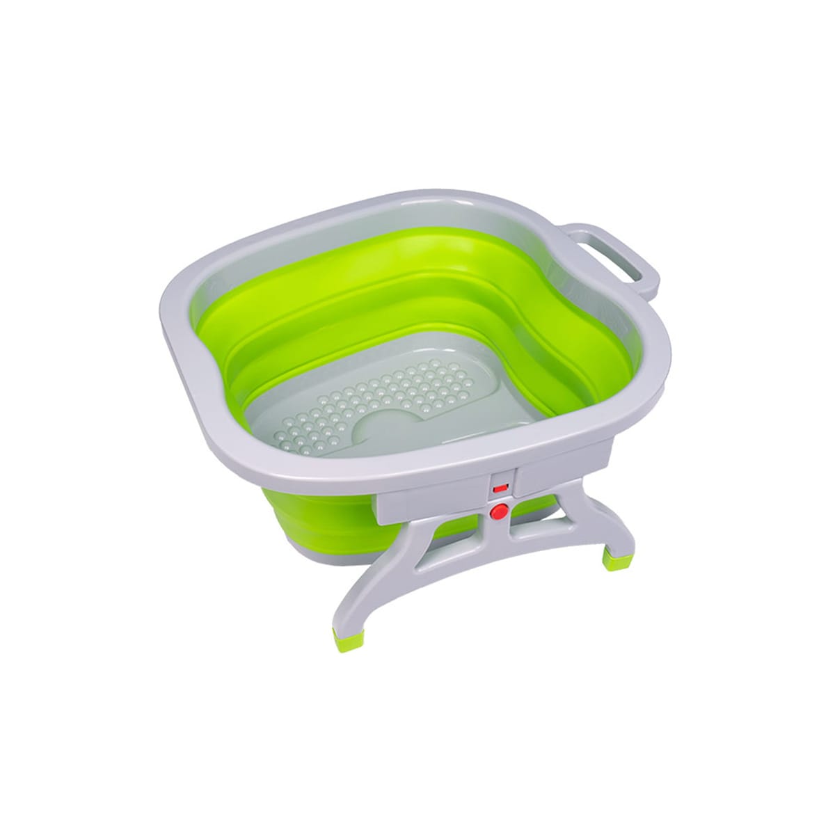 Um den Füßen eine wohlverdiente Auszeit zu gönnen, werden die Seitenteile des in modernem hellgrün und grau gestalteten Wellness-Pools einfach ausgeklappt und der Boden nach unten gedrückt. Sobald die Seiten eingerastet sind, kann auch schon das Wasser eingelassen werden. Jetzt heißt es: rein mit den Füßen, zurücklehnen und entspannen! Für einen sicheren Stand auf glatten Untergründen wie Fliesen oder Laminat sorgen währenddessen die vier rutschfesten Gummifüße. Ist das Fußbad getrocknet, genügt es auf die roten Knöpfe an den Seitenteilen zu drücken, um es wieder platzsparend zusammenzufalten.